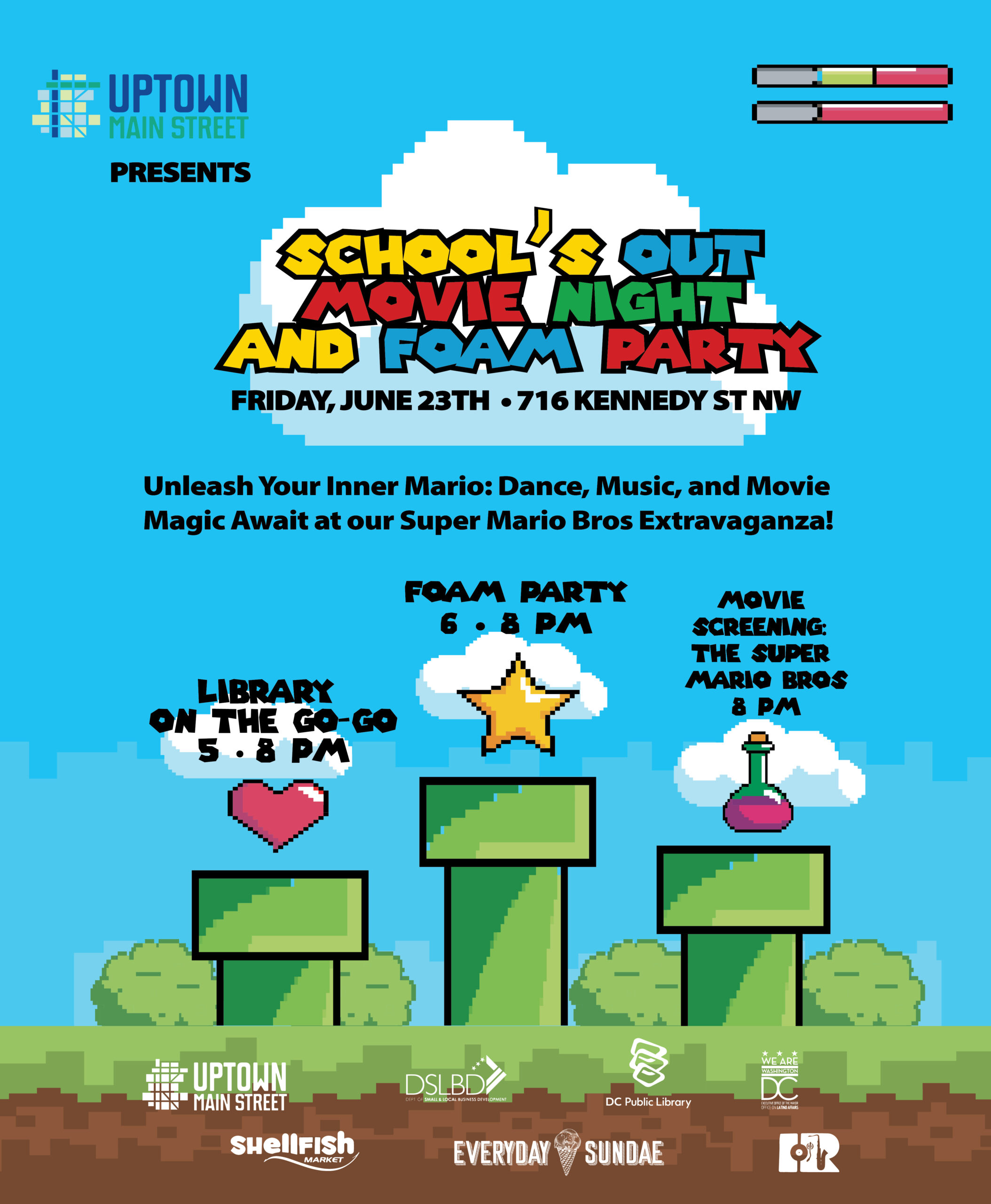 On Friday, June 23 from 5pm-10pm Uptown Main Street and our amazing Kennedy Street Businesses are teaming up to host a Movie Night and Foam Party at 716 Kennedy Street to celebrate the end of the school year! Come enjoy the DC Public Library on the Go-Go mobile unit (5pm-8pm), a foam party (6pm-8pm), and a screening of The Super Mario Bros (at 8pm).