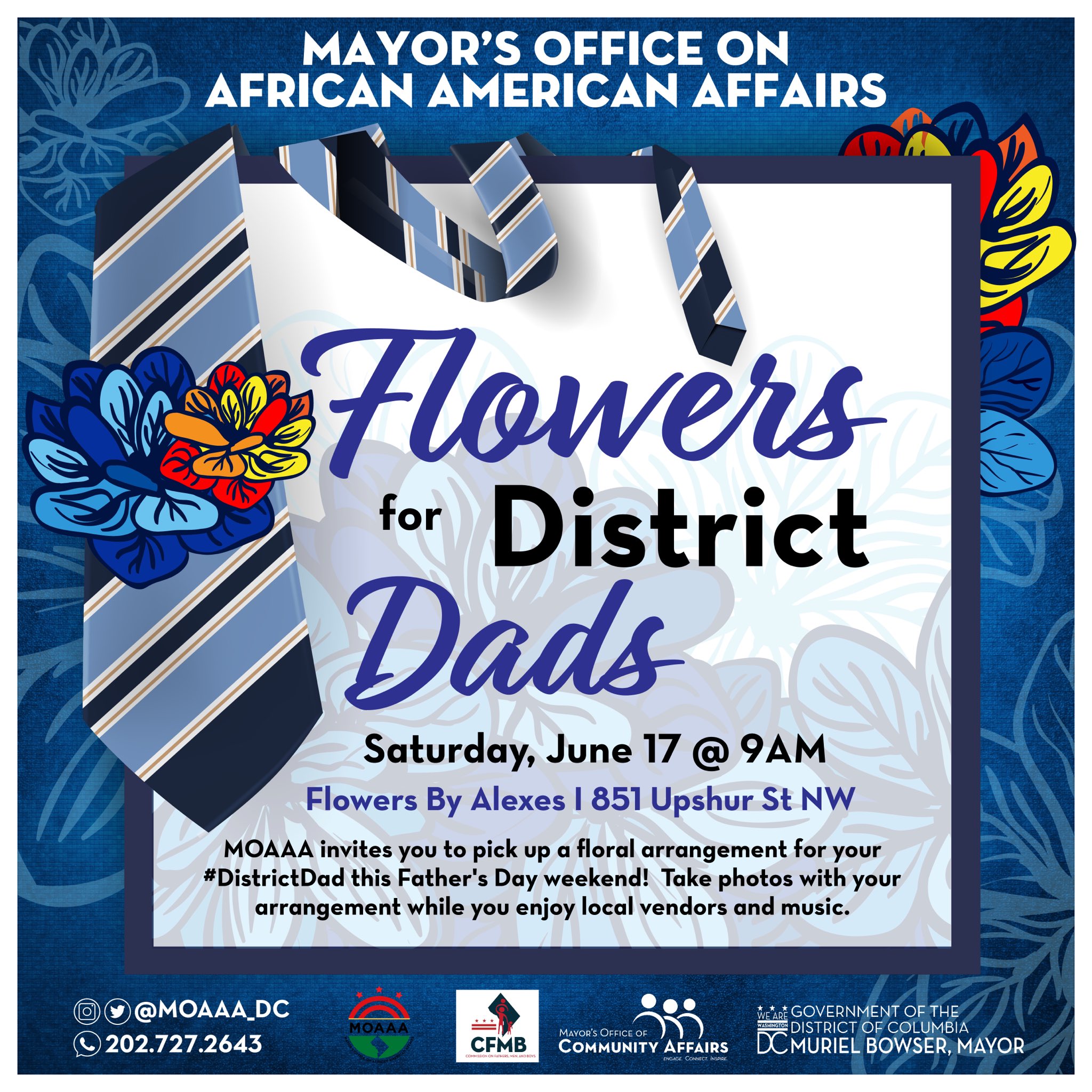 On Saturday, June 17 at 9am-3pm the Office on African American Affairs and Flowers by Alexes (851 Upshur St NW) will host Flowers for District Dads, an event where community members and their dads can come pick up flower arrangements for Father’s Day, take photos with the arrangement, and enjoy local vendors and music on Upshur Street.