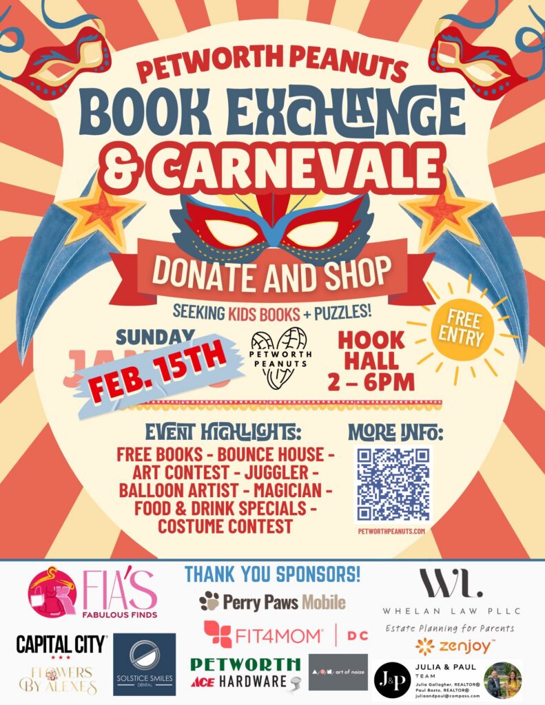 Petworth Peanuts’ Book Exchange and Winter Carnival will take place on Sunday, February 15th from 2 to 6pm at Hook Hall. This fun event will include over a thousand donated kids’ books available for free, plus, tons of free kids’ entertainment, giveaways, and more. Check out the full map of porch locations where book donations can be dropped off, and the event page for more details for attendees.