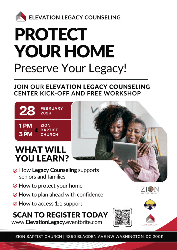 On Saturday, February 28th from 1pm to 3pm, Zion Baptist Church (4850 Blagden Ave NW) is hosting a launch event for Elevation Legacy Counseling. Elevation is a new community-based initiative designed to help seniors protect their homes, preserve generational wealth, and make informed legacy decisions with dignity and clarity. Elevation Legacy Counseling provides a trusted space for difficult conversations around property, family, and legacy, counseling sessions and workshops for seniors and families, focused support that reduces crisis intervention, and a bridge between faith institutions and vetted housing, legal, and aging-service partners. Please join on February 28th and share with a neighbor.