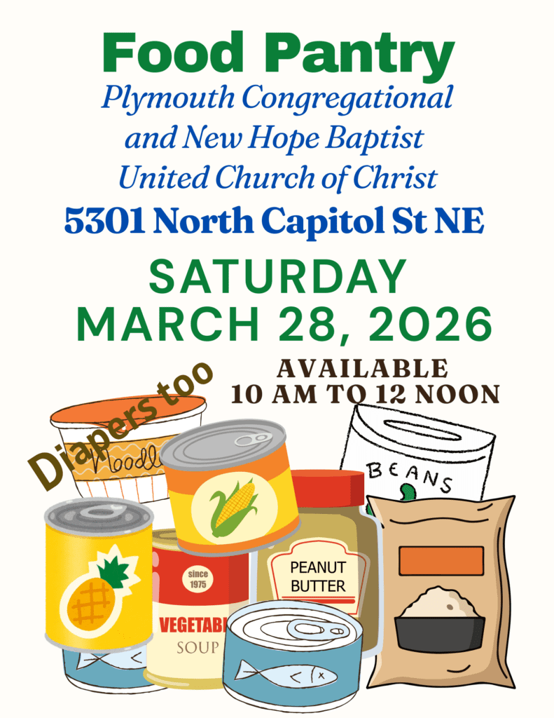 On Saturday, March 28th from 10am to noon, Plymouth Congregational and New Hope Baptist United Church of Christ are joining to host a free food pantry for neighbors in need, taking place at 5301 North Capitol Street, NE.