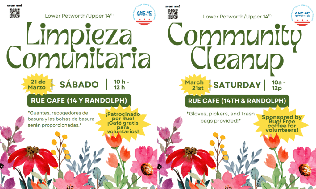 On Saturday, March 21st, join ANC 4C for the start of a monthly cleanup focused on the blocks surrounding 14th Street between Spring and Taylor. Neighbors will meet at 10am on Saturday at Rue Cafe (14th and Randolph). Supplies will be provided, plus free coffee for volunteers!
