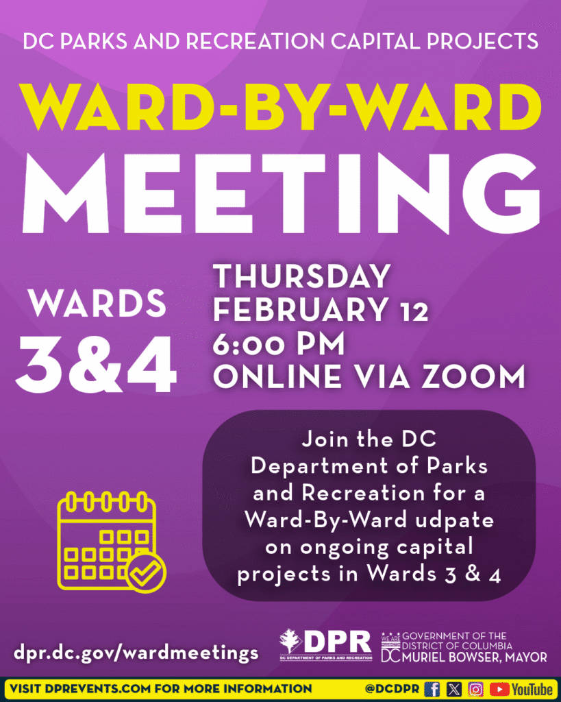 On Thursday, February 12th at 6pm, DPR is hosting a virtual community meeting regarding the upcoming capital construction projects coming to the Wards 3 and 4 communities. For more information and to RSVP, visit DPR’s website.